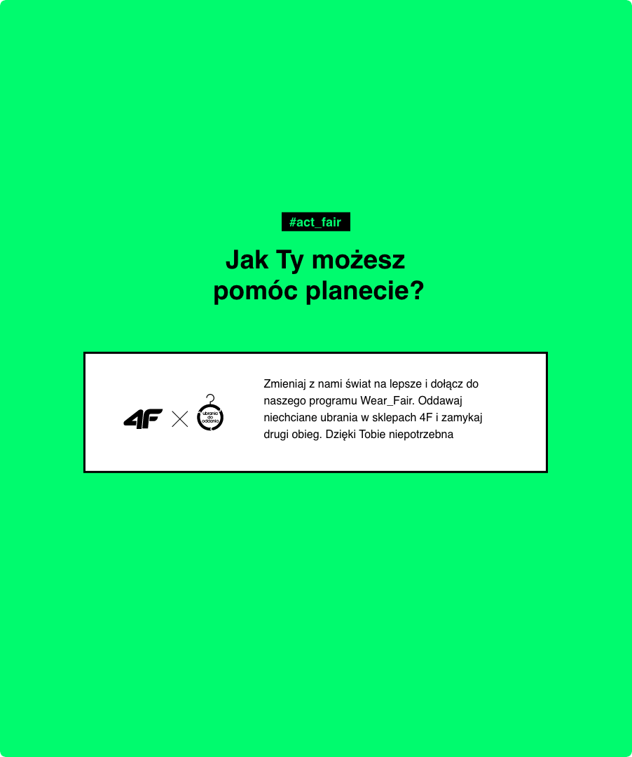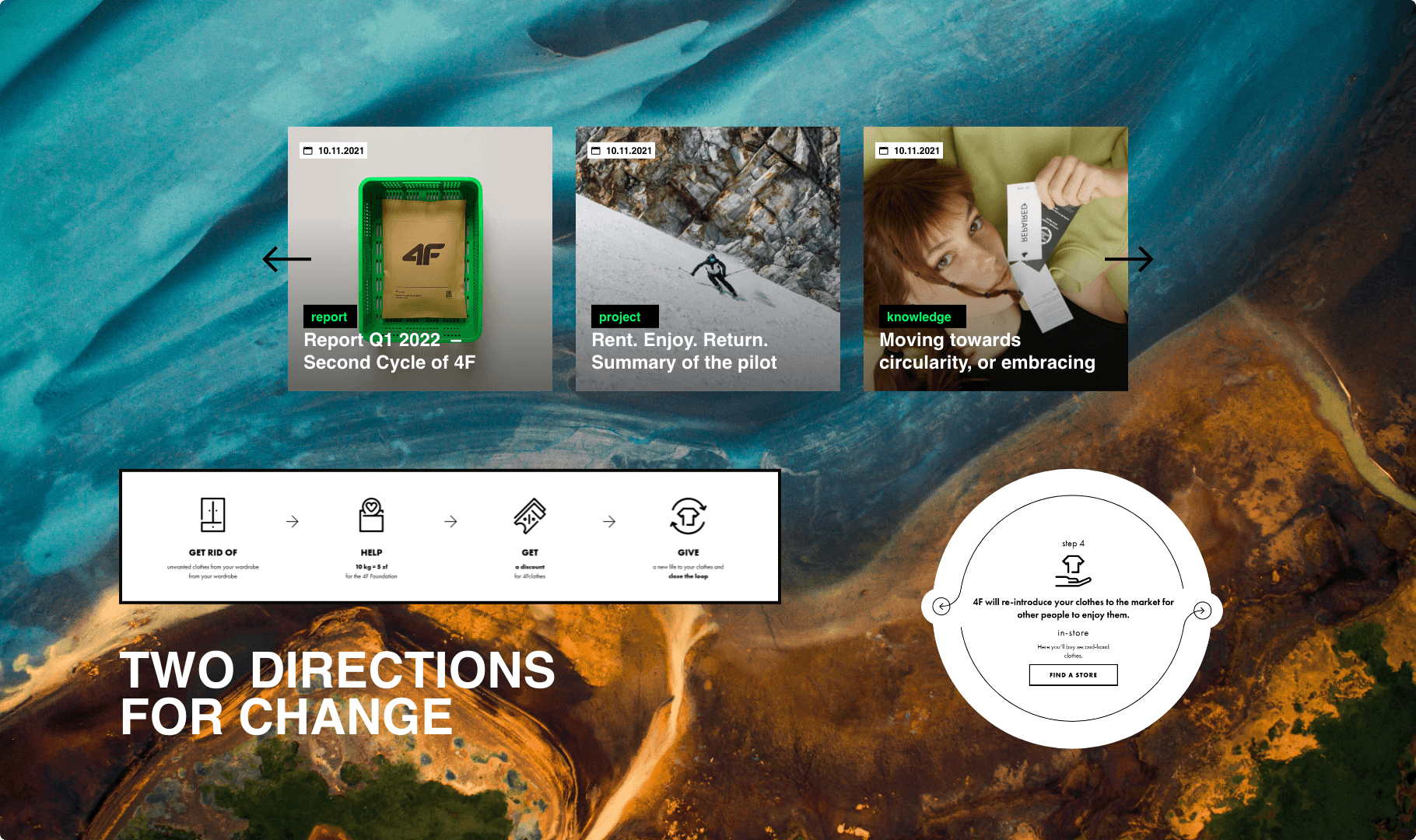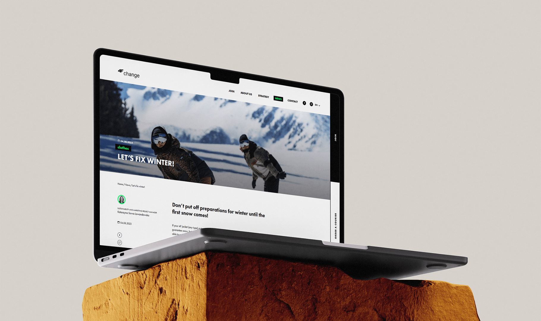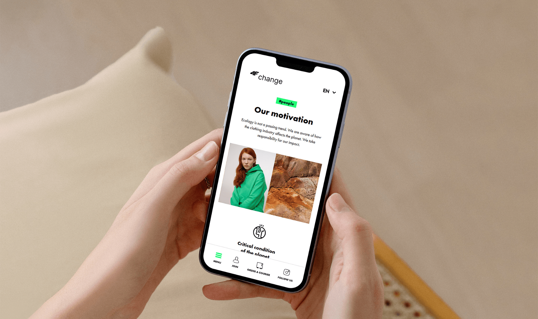 4F Change to coś więcej niż kampania - to ruch zainicjowany przez markę, którego celem jest stworzenie bardziej zrównoważonej branży modowej. Inicjatywa została stworzona przez 4F, jedną z wiodących polskich marek odzieży sportowej, aby promować projektowanie oparte na obiegu zamkniętym, ograniczać ilość odpadów tekstylnych i angażować konsumentów w znaczące działania na rzecz ochrony środowiska.<br /><br /> <br /><br /> Naszym zadaniem było pomóc w przekształceniu 4F Change w samodzielne doświadczenie, które idealnie wpisuje się w wartości marki 4F, a jednocześnie wyróżnia się na tle innych inicjatyw związanych ze zrównoważonym rozwojem. Stworzyliśmy platformę, która edukuje, inspiruje i mobilizuje rosnącą społeczność osób wprowadzających zmiany.<br /><br /> <br /><br /> 4F Change pokazuje, co się dzieje, gdy cel marki spotyka się z przemyślanym wykonaniem, a zrównoważony rozwój nie jest tylko hasłem, ale systemem.