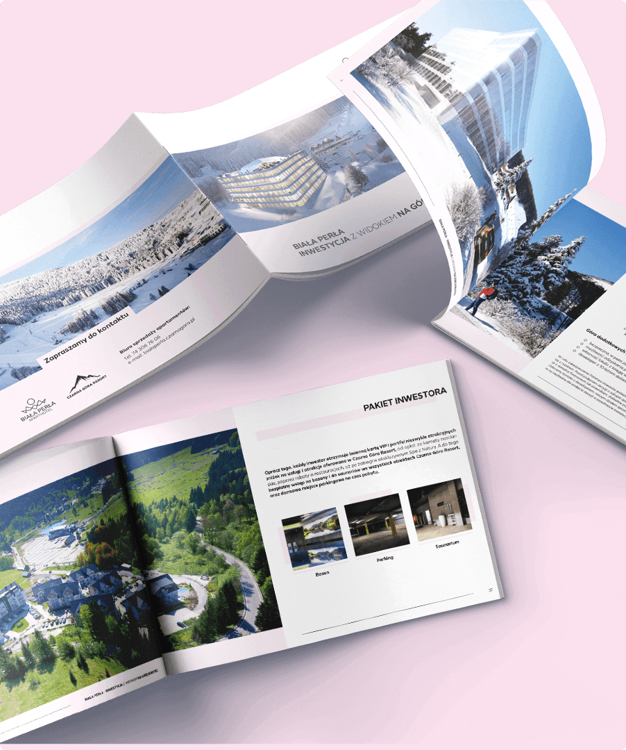 - Materiały reklamowe Zaprojektowaliśmy wysokiej jakości drukowane katalogi dostosowane do potrzeb potencjalnych inwestorów i partnerów. Zawierały one rendery, najważniejsze informacje o lokalizacji, plany pięter i warunki inwestycji, a wszystko to w eleganckim stylu redakcyjnym.