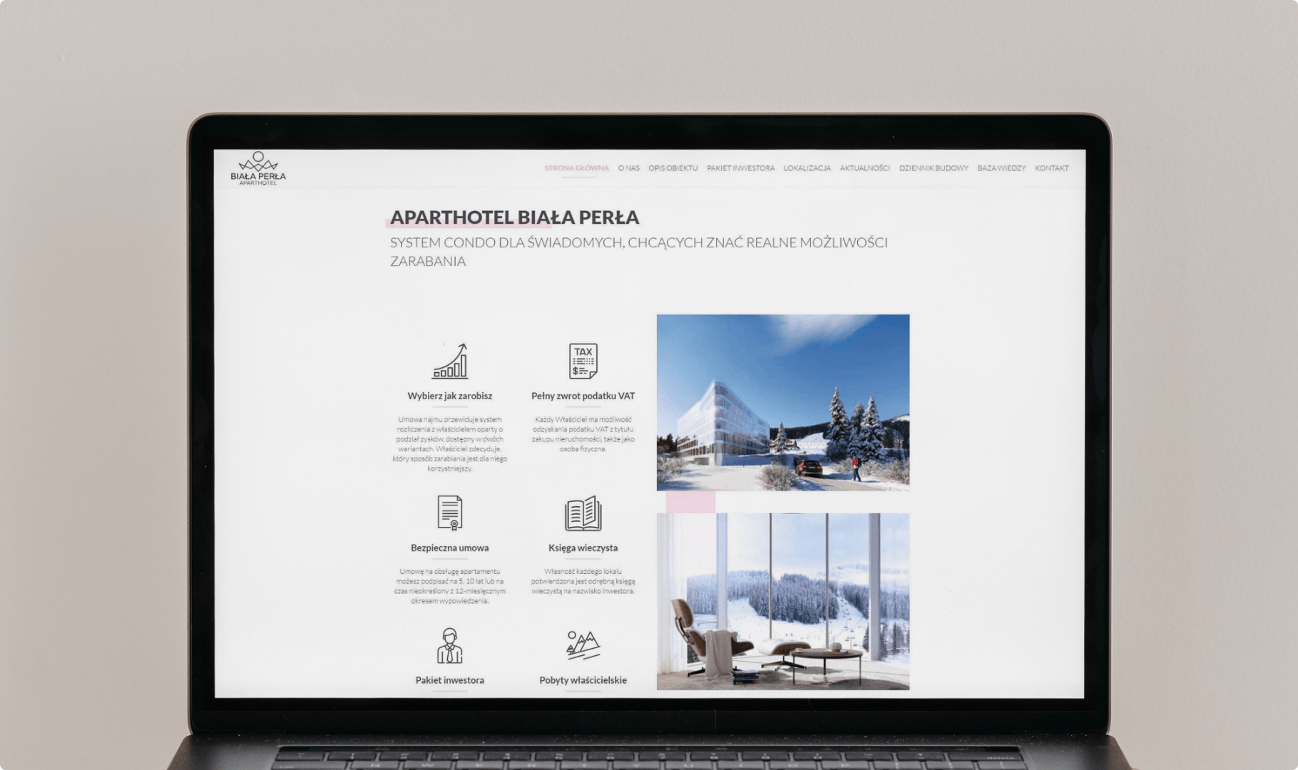 Biała Perła to doskonała okazja inwestycyjna w zakresie hoteli apartamentowych, położona w ośrodku Czarna Góra, jednym z najbardziej cenionych miejsc górskich w Polsce. Projekt ten wymagał holistycznego podejścia, obejmującego identyfikację wizualną, obecność w Internecie oraz strategie marketingowe, aby przyciągnąć zarówno wymagających inwestorów, jak i gości. Poświęcenie naszego zespołu, obejmujące dziesiątki godzin pracy, zaowocowało stworzeniem marki i platformy, które kojarzą się z luksusem, komfortem i potencjałem inwestycyjnym.