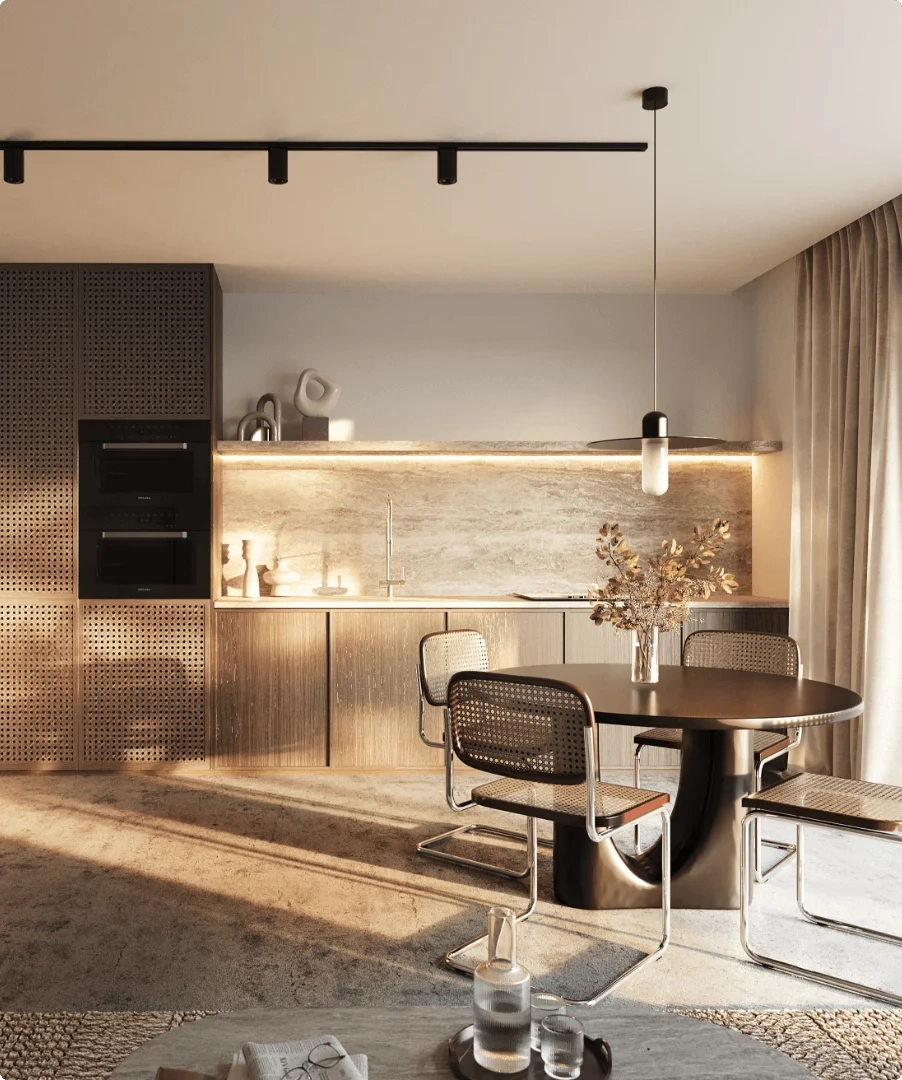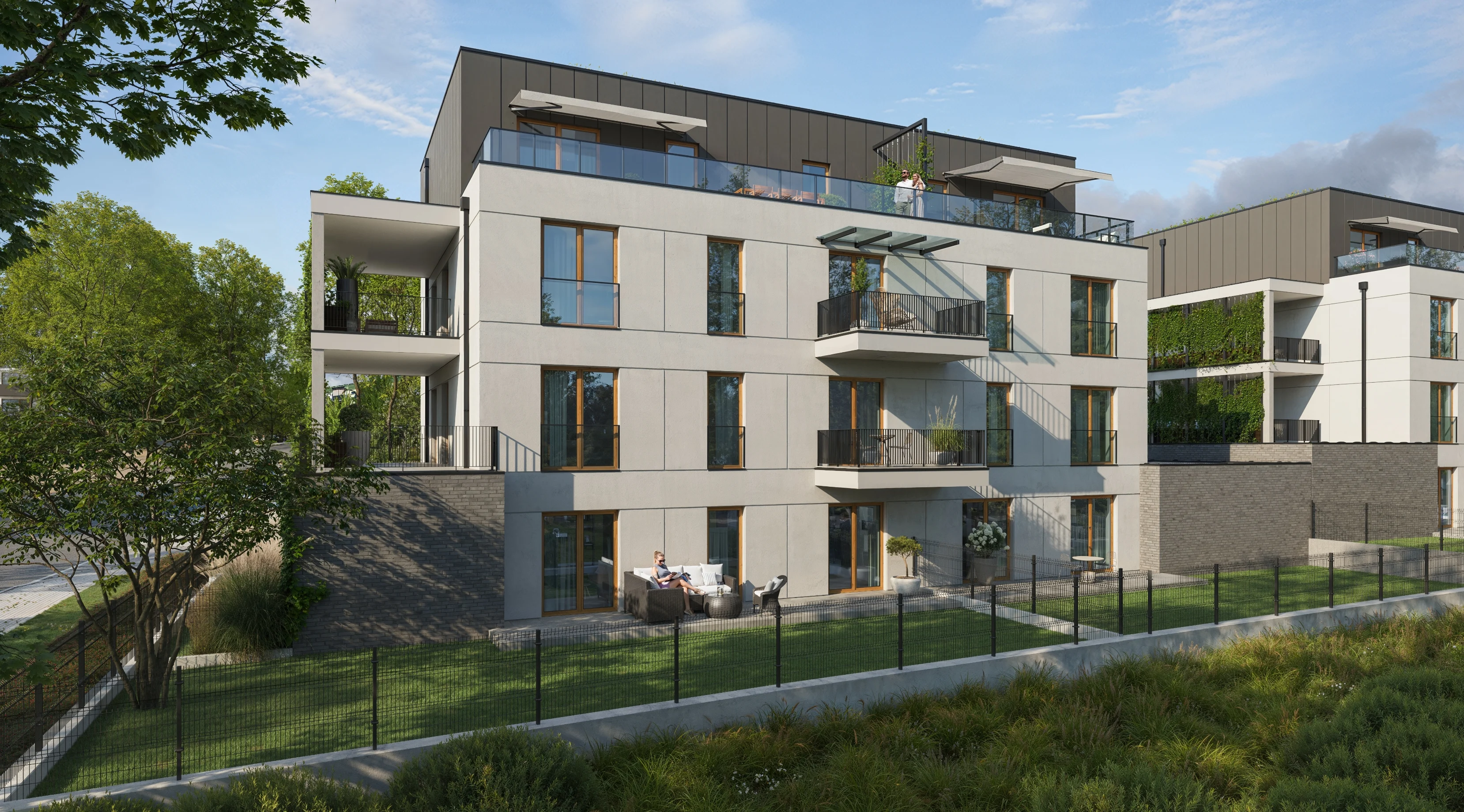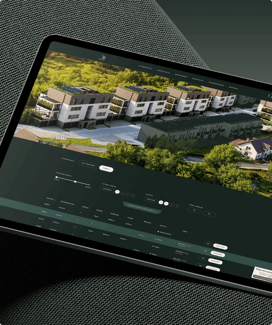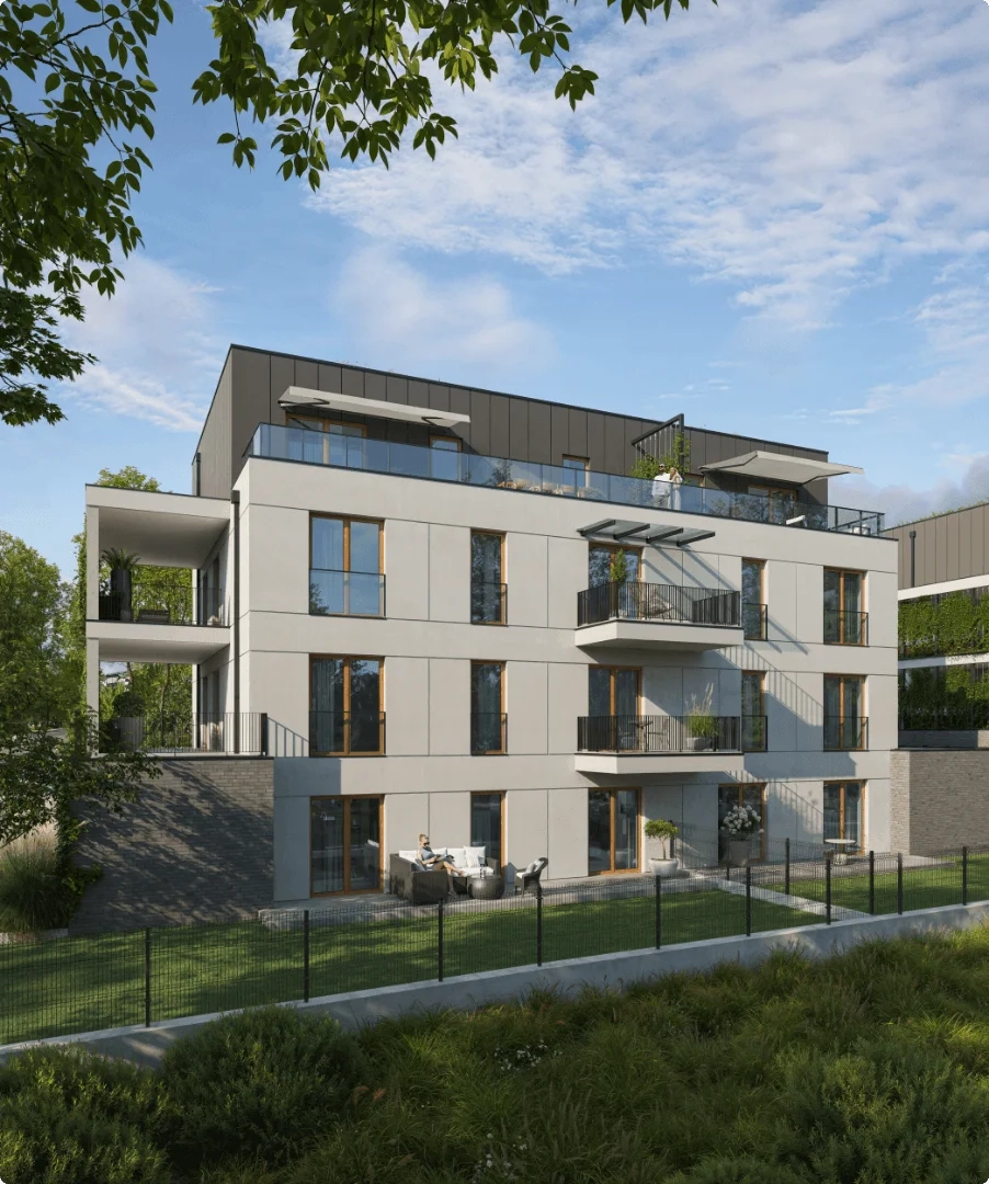 - Komunikacja wizualna Starannie dobrany zestaw wizualizacji architektonicznych i materiałów lifestyle’owych pokazujących harmonię między nowoczesną formą a zielonym otoczeniem.