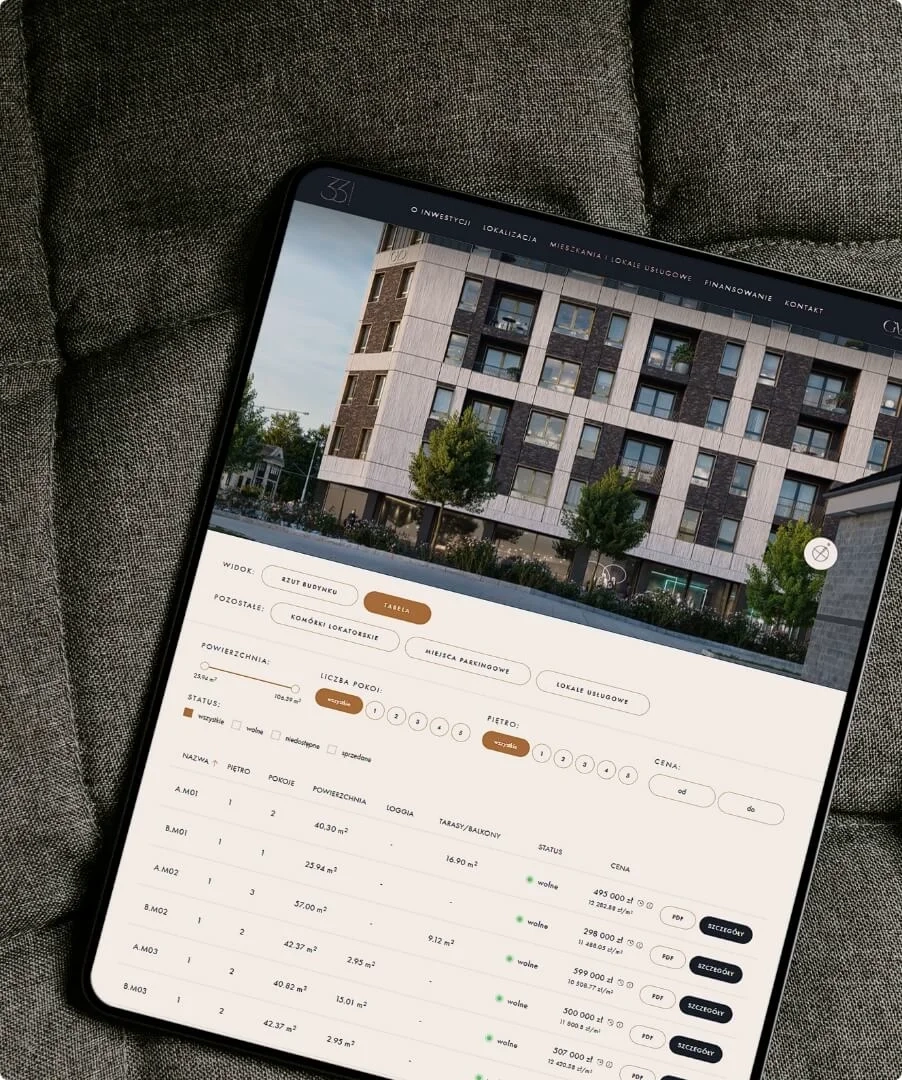 - Karty mieszkań i rzutyZaprojektowane jako przejrzyste i intuicyjne materiały, wykorzystywane zarówno na stronie, jak i w sprzedaży – pomagające szybko zrozumieć układy mieszkań i porównać dostępne opcje.
