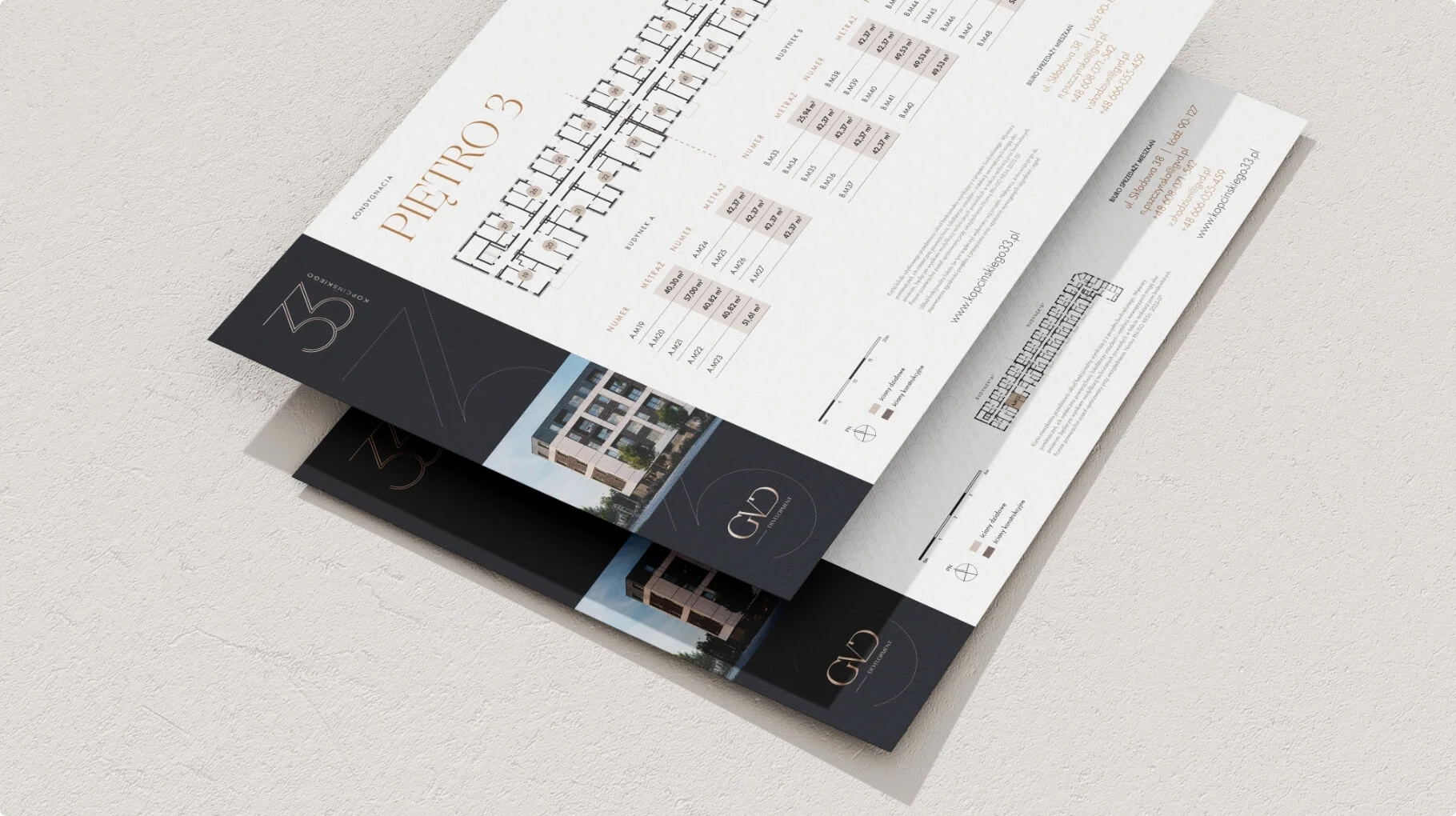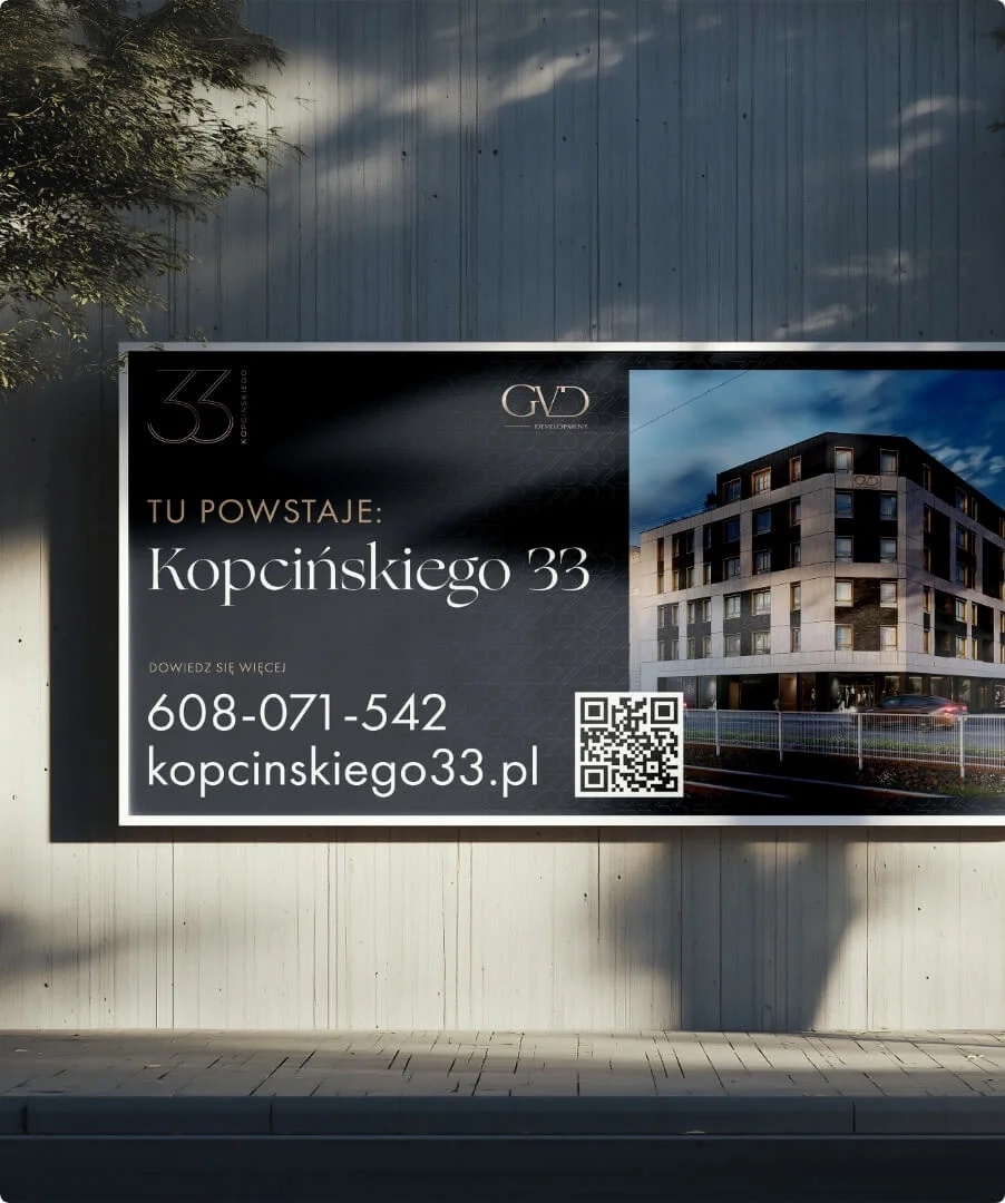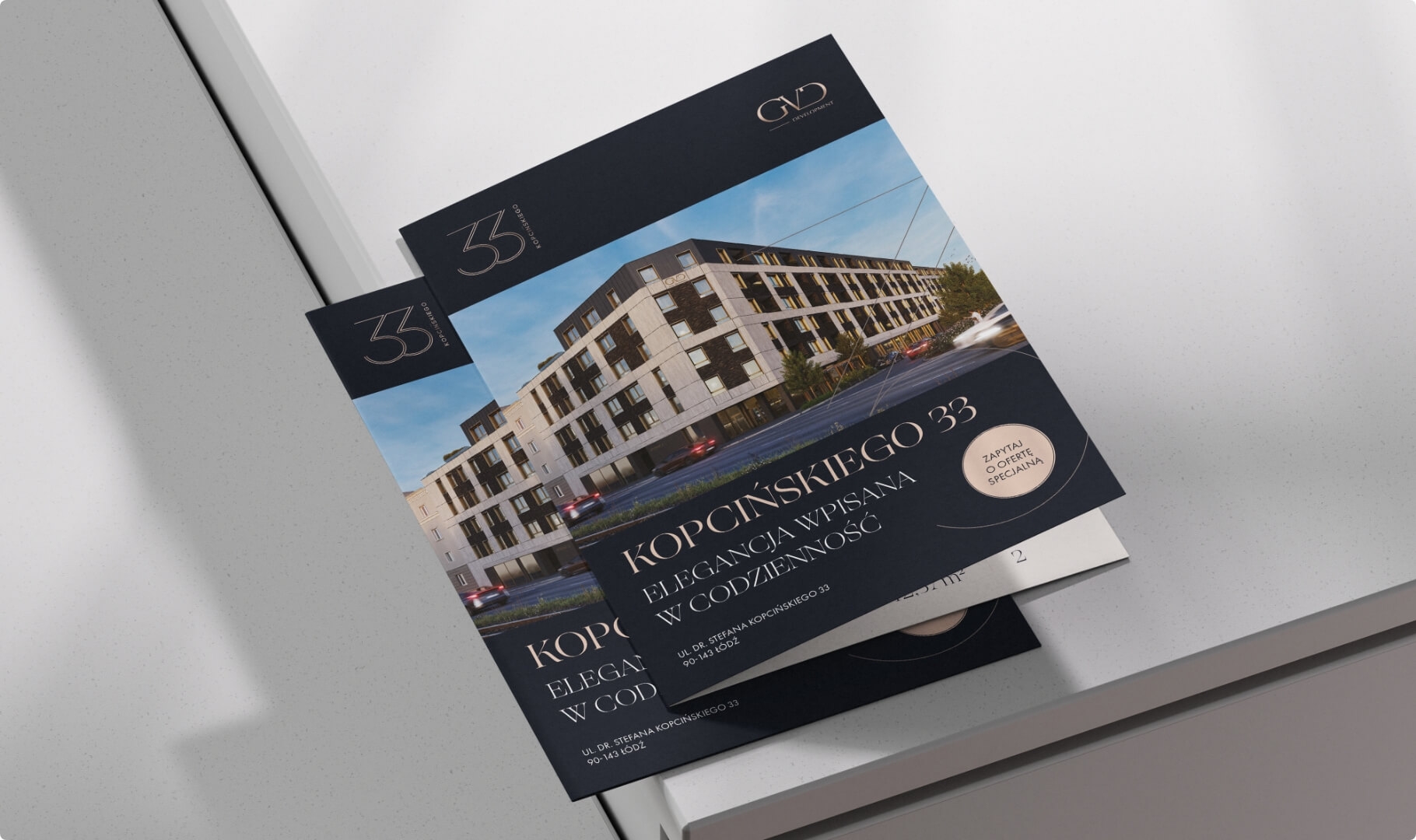 Opracowaliśmy kompleksowy zestaw materiałów marketingowych wspierających promocję i sprzedaż Kopcińskiego 33 – zarówno w kanałach cyfrowych, jak i offline.