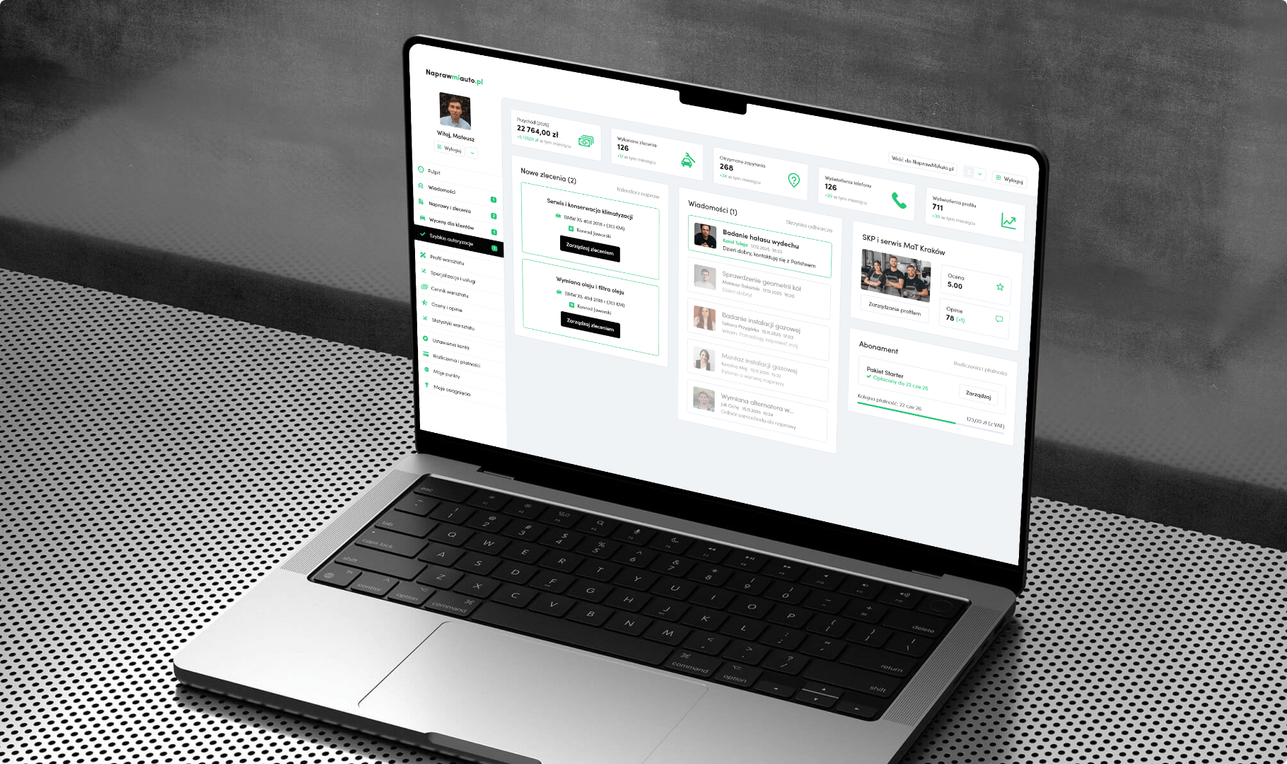 - Panel Warsztatu (B2B) Zaawansowany interfejs pozwalający zarządzać subskrypcją, ofertą, cenami, dostępnością oraz komunikacją z klientami.