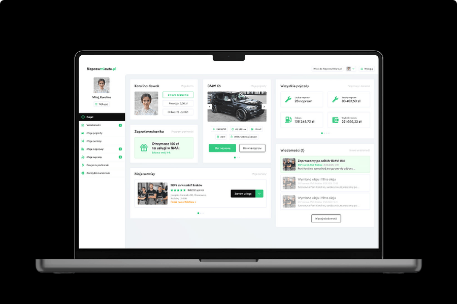 - Panel Klienta (B2C) Intuicyjny dashboard umożliwiający zarządzanie profilem, wizytami, opiniami o warsztatach i informacjami o pojeździe.