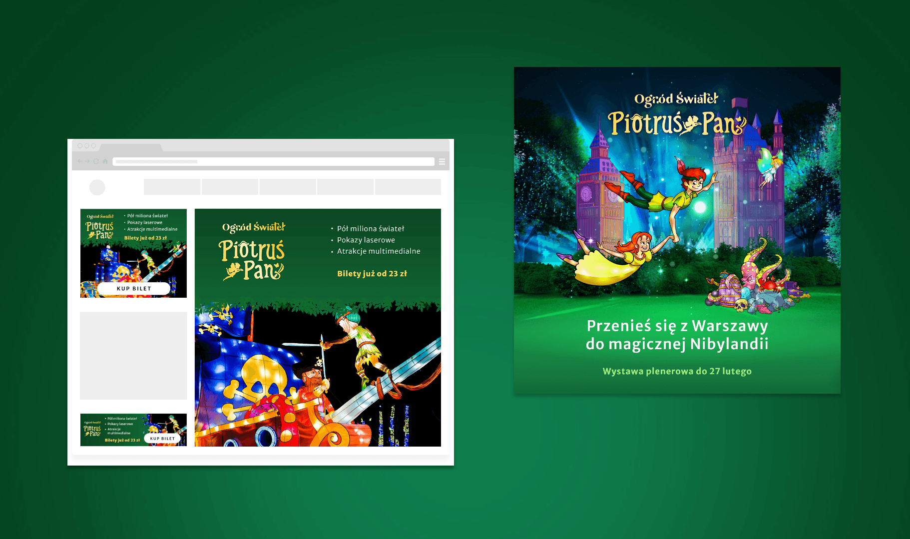 Wystawa „Ogród Świateł: Piotruś Pan” przekształciła Śląski Ogród Botaniczny w fascynujący świat inspirowany ukochaną opowieścią o Piotrusiu Panu. Nasz zespół opracował spójną identyfikację wizualną, która łączyła nostalgię z nowoczesnością, zaprojektował atrakcyjną i interaktywną stronę internetową wraz z interaktywną mapą atrakcji oraz przeprowadził ukierunkowaną kampanię marketingową, aby zwiększyć frekwencję. Dzięki płynnej integracji animacji, technologii i narracji pomogliśmy stworzyć niezapomniane wrażenia, które zachęciły was do ponownego odkrycia magii Nibylandii.