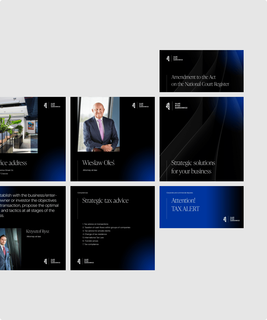 Kancelaria Oleś Rysz Sarkowicz jest jedną z najbardziej szanowanych butikowych kancelarii prawnych w Polsce, znaną z międzynarodowego zasięgu, kompleksowej obsługi transakcji i podejścia zorientowanego na klienta. Dzięki biurom w Krakowie i Warszawie oraz ponad 30-letniej historii kancelaria cieszy się zaufaniem globalnych klientów dzięki swojej precyzji, dyskrecji i wiedzy specjalistycznej.<br /><br /> <br /><br /> Aby odzwierciedlić jej współczesne podejście i globalne ambicje, ściśle współpracowaliśmy z kancelarią nad redefinicją jej obecności w sieci, opracowując nową identyfikację wizualną i niekonwencjonalną stronę internetową, która wykracza poza tradycyjną estetykę sektora prawnego, jednocześnie wzmacniając wiarygodność i wyrafinowanie kancelarii.