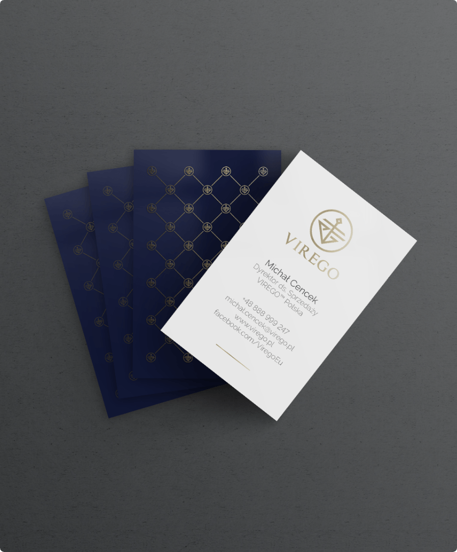 Identyfikacja wizualna firmy VIREGO została opracowana tak, aby odzwierciedlać międzynarodowy zasięg i strategiczne podejście firmy, pozostając jednocześnie przystępną i elastyczną w zastosowaniu na różnych rynkach i w różnych usługach.